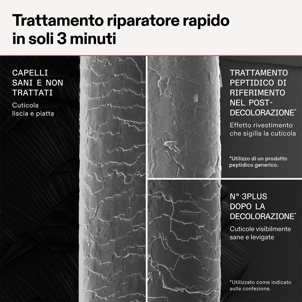 Sgomberiamo subito il campo dalle incomprensioni: il N°.3PLUS è uno strumento tecnico pre-shampoo ad altissime prestazioni. Progettato per agire con la massima potenza in appena 3 minuti , ha un obiettivo chiaro e dritto al punto: riparare rapidamente i danni passati, presenti e futuri. È formulato per trasformare i capelli danneggiati, rendendoli immediatamente più forti e morbidi prima ancora di passare al lavaggio al lavatesta. È un prodotto trasversale che funziona su tutti i tipi di capelli ed è rigorosamente privo sia di proteine che di coloranti.