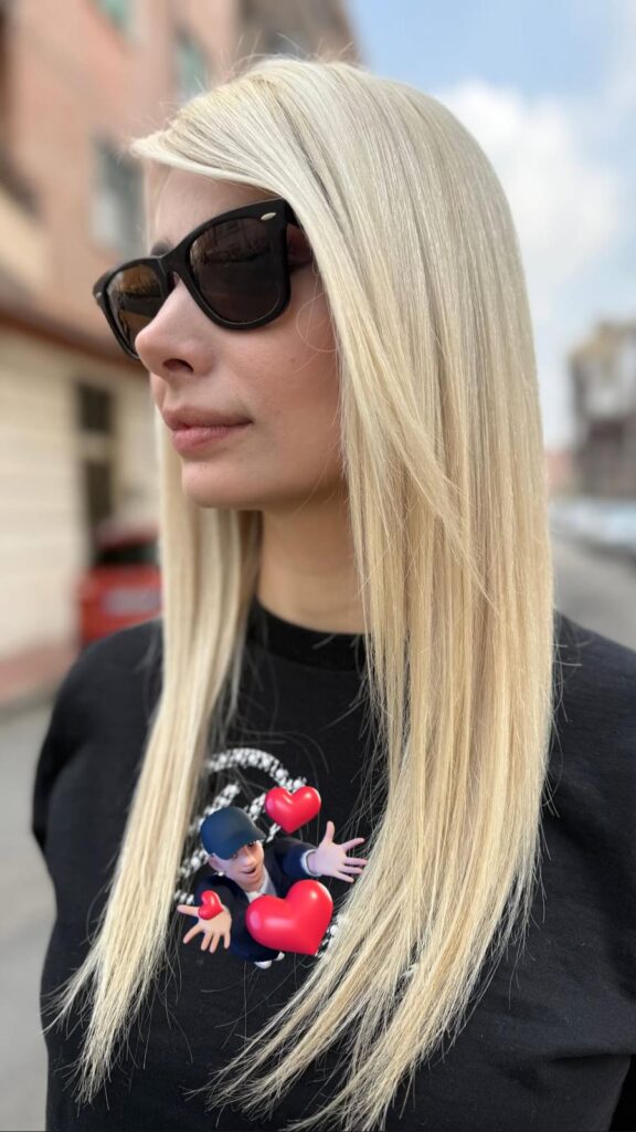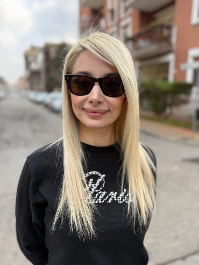 La nostra modella parte da un’altezza di tono 4 naturale. Come sanno tutti i professionisti del settore, per quanto si possa essere eccellenti e precisi nella tecnica delle schiariture, l’uso ripetuto di decolorante (persolfato di ammonio) lascia il segno.
