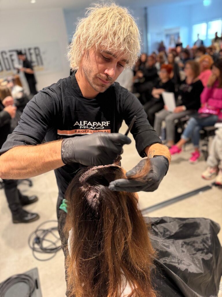 Mentre Roberto illustrava la parte tecnica, sul palco lavoravano i ragazzi dell’Attilio Artistic Team di Lorenzo Marchelle (Ambassador Alfaparf) e le stylist di Glamrocksalon.