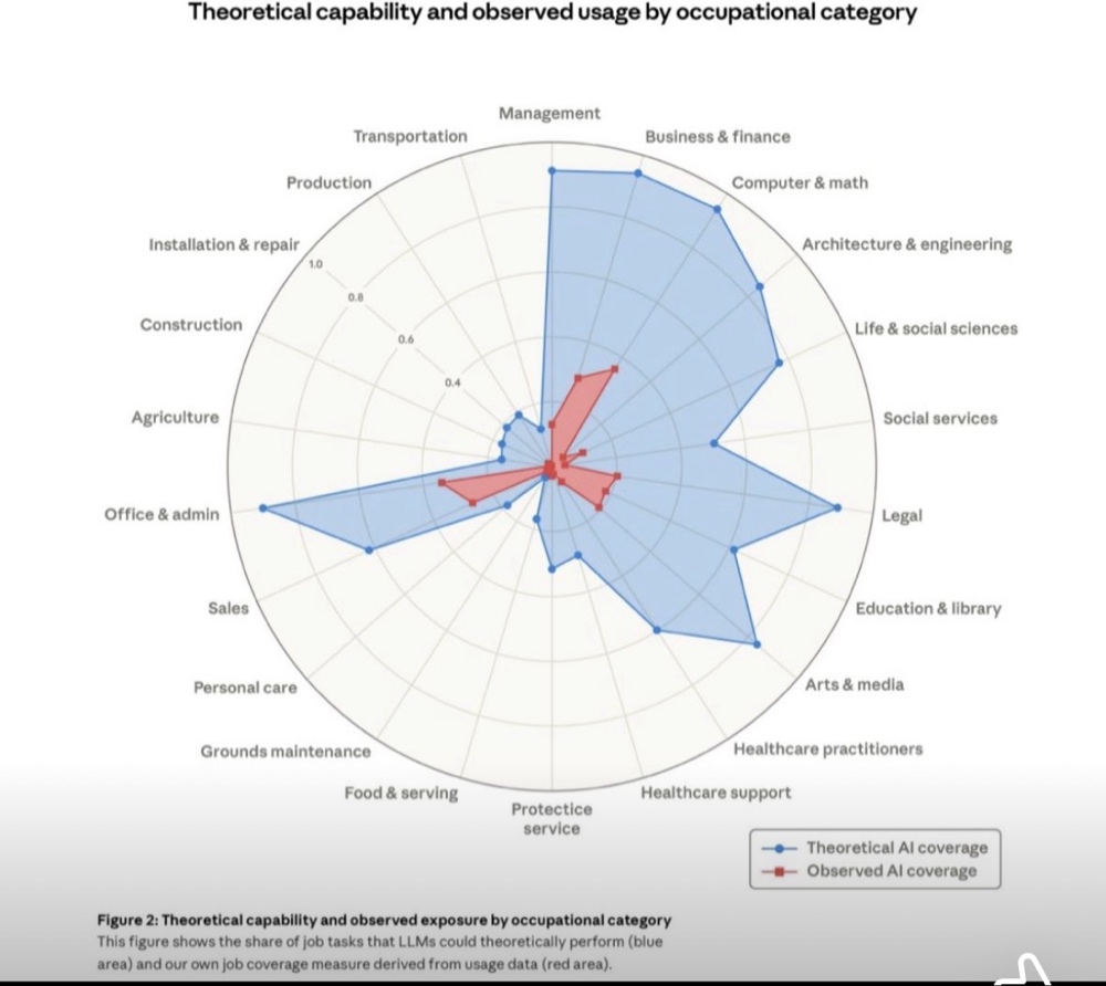 Osservate la vasta area azzurra (quella chiamata “Theoretical AI coverage”). Rappresenta ciò che l’IA potrebbe già fare oggi. È un mostro che divora intere categorie. Vedete dove tocca le vette più alte? “Legal” (Avvocati), “Business & Finance” (Commercialisti), “Computer & Math” (Programmatori). Queste professioni sono già, tecnicamente, dei “morti che camminano”. La loro utilità teorica è stata quasi azzerata.