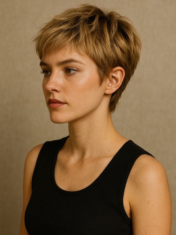 - Pixie leggero e spettinato — voluminoso ma non “tirato”; perfetto per chi vuole poca manutenzione.
