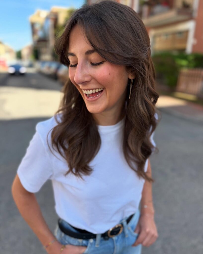 Sul colore, invece, ho voluto mantenere una tonalità calda e luminosa: un castano cioccolato impreziosito da riflessi leggermente caramellati, tono su tono. Niente stacchi netti, niente effetti artefatti: solo una luce diffusa che si accende con il sole e rende l’insieme super naturale. È il tipo di colore che piace tanto perché “non sembra tinta”, ma fa la differenza eccome.