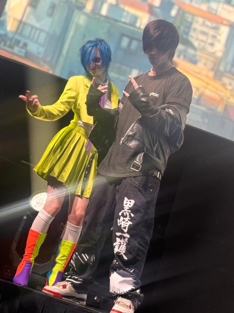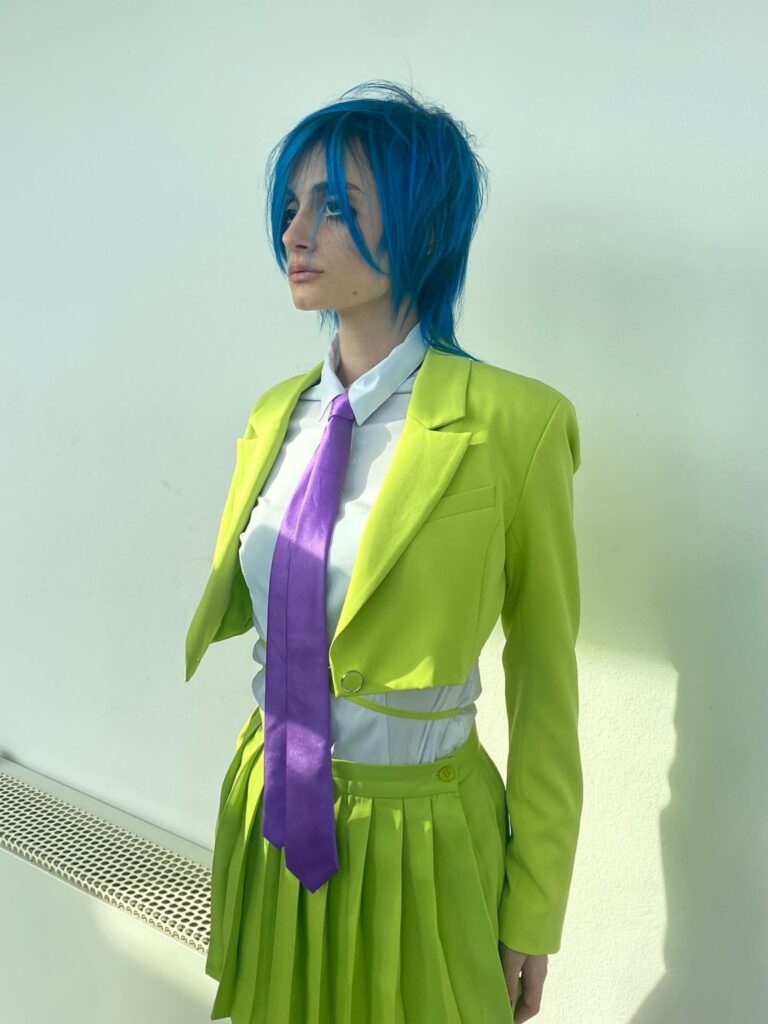 Il look della modella con completo lime e cravatta viola è quello che rappresenta meglio l’estetica manga.