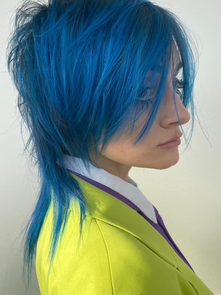 Un mullet futuristico con sommità compatta, scalature profonde e lunghezze sottili che scendono morbide sulla schiena.
