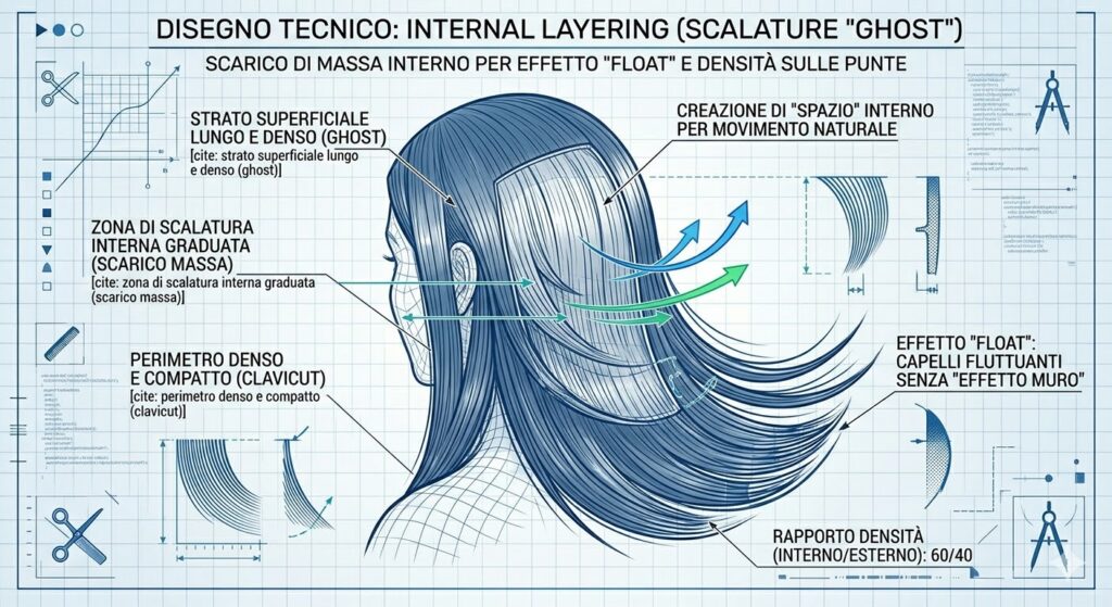- Internal Layering: Per evitare l’effetto “muro”, lavoriamo con scalature interne “ghost”. Questo scarico di massa crea lo spazio necessario affinché i capelli possano fluttuare senza perdere densità sulle punte.