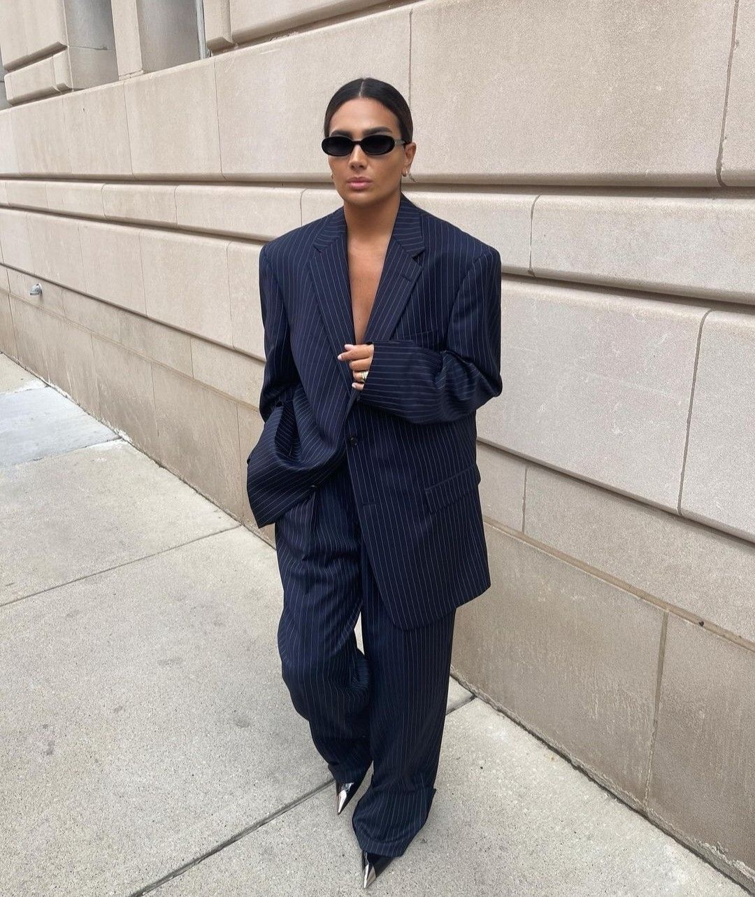 L’outfit che ha catturato l’attenzione è un tailleur oversize color crema, con spalle strutturate e una silhouette rilassata. La giacca dal taglio maschile è abbinata a pantaloni fluidi, creando un perfetto equilibrio tra potenza e raffinatezza. Sotto la giacca, una camicia di seta trasparente lascia intravedere un reggiseno bralette in pizzo, donando sensualità senza eccessi. Ai piedi, immancabili décolleté slingback in pelle nude, per allungare la figura con discrezione.