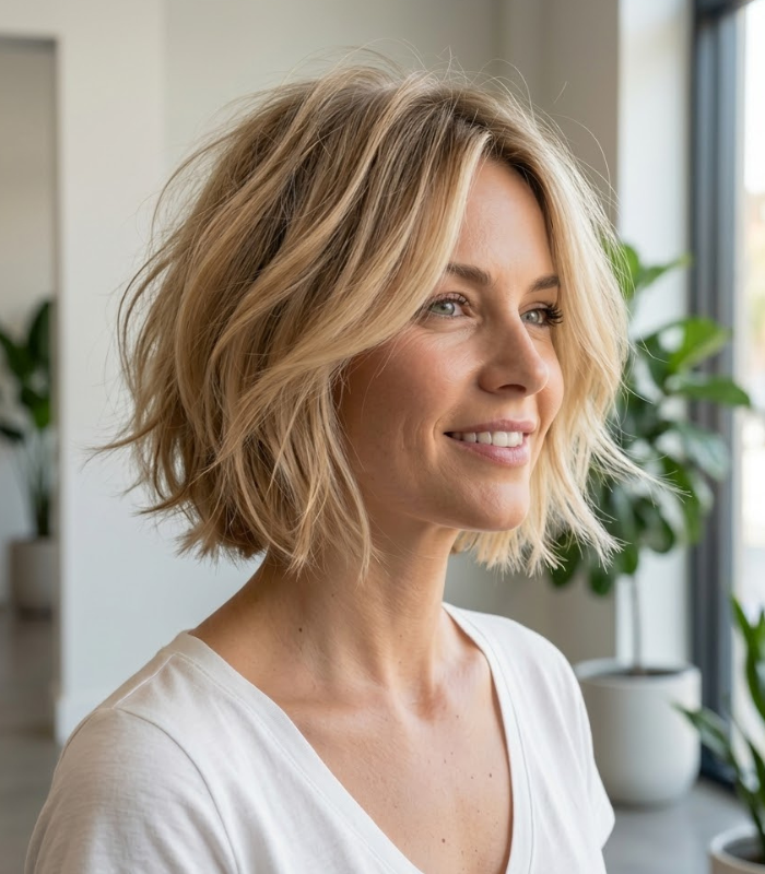 Per esaltare il Soft Airy Bob, la tecnica di asciugatura è fondamentale ma rapidissima. Dimenticate la spazzola tonda per ore: basta un diffusore o un’asciugatura a testa in giù con un pizzico di mousse volumizzante. Il segreto è mantenere la texture “viva”. Evitate i gel pesanti; puntate su spray salini o polveri texturizzanti che lasciano la fibra libera di fluttuare.