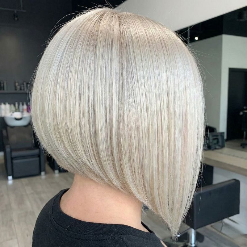Questa immagine enfatizza la costruzione “architettonica” del taglio, con una nuca cortissima che si allunga drammaticamente verso il davanti. Il biondo platino esalta la pulizia della linea.