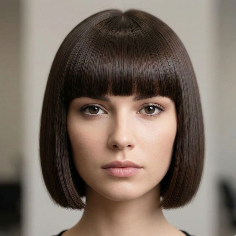 Un primo piano frontale che mostra la severità della frangia dritta e piena, abbinata a un taglio pari al mento. Lo sguardo diretto della modella rinforza il concetto di “dittatura” dello stile.