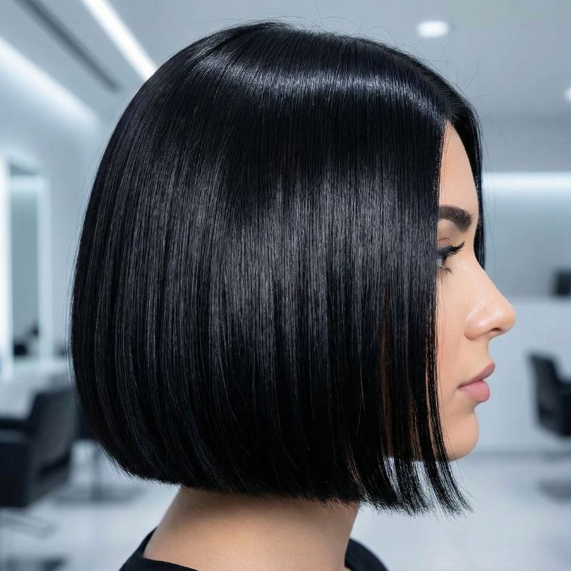 Un profilo netto che mostra la linea di taglio perfetta, parallela al pavimento, e la texture “a specchio” dei capelli neri. È l’essenza della precisione geometrica.